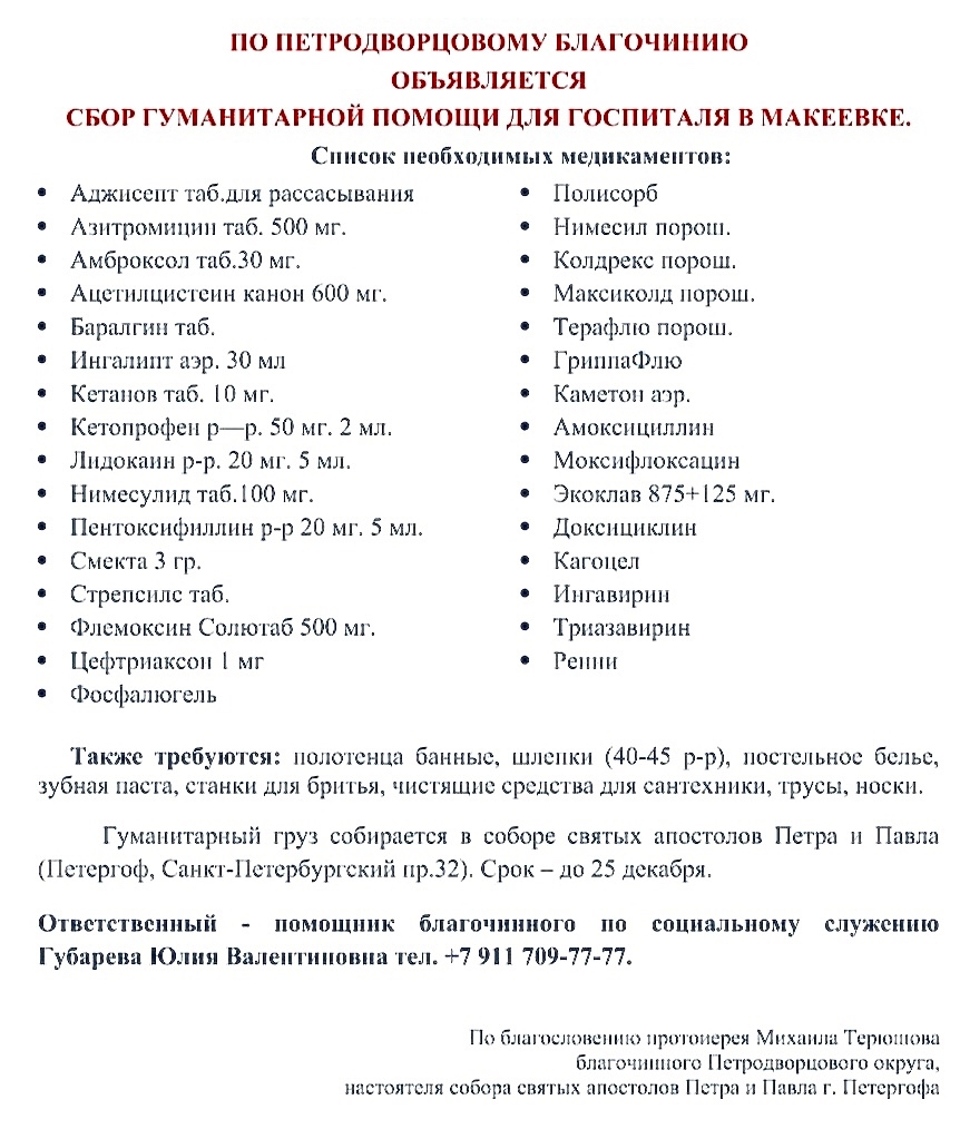 По благословению благочинного Петродворцового округа Санкт-Петербургской епархии протоиерея Михаила Терюшова объявлен сбор гуманитарной помощи для госпиталя в Макеевке.